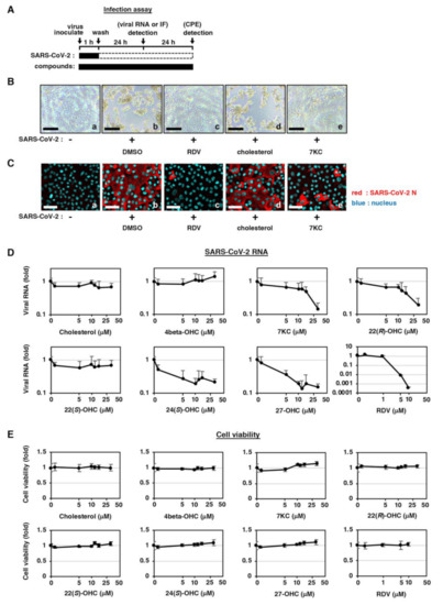 Oxysterols inhibit SARS-CoV-2 infection. (A) Schematic model of the SARS-CoV-2 infection assay. VeroE6 cells overexpressing transmembrane protease, serine 2 (TMPRSS2) were inoculated with SARS-CoV-2 in the presence of compounds for 1 h, followed by washing out the free virus and incubating the cells with the compounds for 24 or 48 h. Viral RNA in the culture supernatant and viral N protein in the cells was quantified at 24 h post-inoculation by real-time RT-PCR and immunofluorescence analyses, respectively. Cytopathic effects (CPE) were viewed under a microscope at 48 h post-inoculation. Solid and dashed boxes indicate the periods that the cells were treated with and without the compounds or the virus, respectively. (B) Images of the cells treated with the virus in the presence of dimethyl sulfoxide (DMSO), 10 μM Remdesivir (RDV), 30 μM cholesterol, or 30 μM 7-ketocholesterol (7-KC). Scale bar, 100 μm. (C) Viral N protein in the cells was detected by indirect immunofluorescence analysis. The red and blue signals represent viral N protein and nuclei, respectively. Scale bar, 50 μm. (D) Dose-response curves for SARS-CoV-2 RNA upon treatment with the compounds as indicated. OHC: hydroxycholesterol. Viral RNAs in the culture supernatant were quantified by real-time RT-PCR and plotted against compound concentrations up to 30 μM. (E) Viability of cells treated with compounds as indicated for 24 h was quantified using an MTT assay.