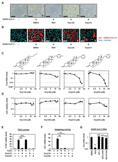 Oxy210, an oxysterol derivative, potently inhibits the SARS-CoV-2 propagation and alleviates the virus-induced CPE. (A) Virus-induced CPE was examined in the cells inoculated with the virus in the presence of DMSO, 10 μM RDV, 10 μM Oxy133, or 10 μM Oxy210. Scale bar, 100 μm. (B) Viral N protein in the cells was detected by immunofluorescence analysis as described in Figure 1C. Scale bar, 50 μm. (C) Dose-response curves for viral RNA upon treatment with oxysterol derivatives as indicated. The secreted viral RNA in the culture supernatant at 24 h post-inoculation was quantified by real-time RT-PCR and plotted against compound concentration. The chemical structures of oxysterols are also shown above the graphs. (D) Viability of cells treated with the compounds was quantified using an MTT assay. (E,F) Inhibitory effects toward transforming growth factor β (TGFβ) and hedgehog (Hh) signaling. NIH3T3 cells pretreated with or without 10 μM Oxy210 or 10 μM Oxy232 for 2 h were stimulated with 20 ng/mL TGFβ (E) or with conditioned medium (CM) from CAPAN-1 human pancreatic tumor cells that contain Shh (F) [15,16] in the presence or absence of the compounds at 10 μM. Cellular mRNAs were extracted to quantify a TGFβ-downstream gene, connective tissue growth factor (CTGF) (E), a Hh target gene, Gli1 (F), and Oaz1 for normalization of CTGF and Gli1 (E,F). (G) At 24 h post-inoculation, Viral RNA produced from the cells treated with DMSO, 10 μM RDV, 10 μM HPI-1, 10 μM GDC-0449, or 10 μM SB-431542, was quantified with real-time RT-PCR. All data are shown with error bars indicating S.D., ** p < 0.01 vs. DMSO; N.S., not significant, with Student’s t-test.