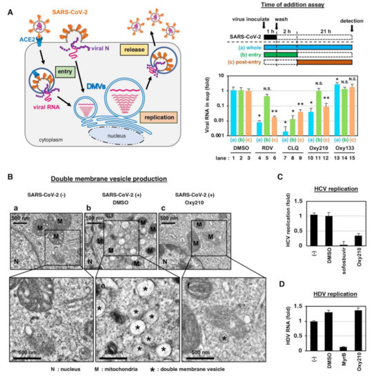 Coronaviruses generally induce the formation of unique membrane compartments, called double-membrane vesicles (DMVs), which enable an efficient viral RNA replication [18,26]. We found that DMV formation occurs with infection by SARS-CoV-2 in VeroE6/TMPRSS2 cells (Figure 3B, panels b,e, *). Interestingly, treatment with Oxy210 remarkably reduced the DMV formation in the SARS-CoV-2-infected cells (Figure 3B, panels c,f, *). We examined the specificity of Oxy210′s effect on DMV-dependent virus replication by evaluating the antiviral effect on hepatitis C virus (HCV) and hepatitis D virus (HDV), which are other RNA viruses that drive replication in a DMV-dependent and -independent manner, respectively [26,27]. Similar to the effect of an HCV polymerase inhibitor, sofosbuvir, used as a positive control, Oxy210 reduced the DMV-dependent RNA replication of HCV (Figure 3C), while the antiviral activity was not observed in HDV infection that was inhibited by the positive control, MyrB (Figure 3D). These data are consistent with the idea that Oxy210 specifically inhibits the DMV-dependent virus replication, although it remains to be determined whether Oxy210 directly inhibits the DMV formation machinery, which we will examine in future studies (see the discussion below).