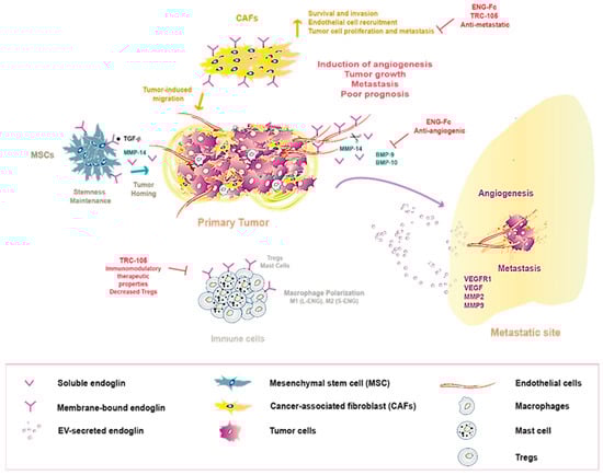 The tumor microenvironment (TME) plays a crucial role in cancer initiation and progression, a milieu that it is comprised of different cell types, including MSCs, fibroblasts, ECs, vascular cells, and immune cells [142]. The dynamic interplay between non-malignant cells and primary neoplastic cells is now well established, which contributes to tumor–stroma co-evolution and favors tumor promotion and metastasis [142,143,144]. ENG is present in some cell types that comprise the TME (e.g., ECs, MSCs, cancer-associated fibroblasts (CAFs), immune cells), actively regulating their behavior during tumorigenesis (Figure 2) [143].