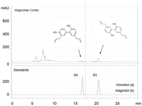 Identification of the active components in Magnoliae by Cortex using HPLC. Two major compounds of Magnoliae Cortex (M.C), honokiol (0.8%) and magnolol (2.1%), were identified using HPLC by comparing the retention time and UV spectra of the standard compounds.