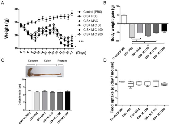 Cisplatin, a common chemotherapy medication, causes rapid weight loss in mice. Mice were injected intraperitoneally daily with cisplatin (2.5 mg/kg) on days 1–5 and 26–30. Magnolol (10 mg/kg) was administered intraperitoneally every 3 days (for a total of 12 times) and was used as a positive control [24]. M.C (50, 100, and 200 mg/kg) was administered orally every 3 days (for a total of 12 times). Phosphate-buffered saline (PBS) was administered orally every 3 days. As expected, the cisplatin injection resulted in body weight loss in mice; however, the administration of M.C and magnolol alleviated cisplatin-induced weight loss (Figure 2). The induction of weight loss with cisplatin showed a rapid decrease and a partial recovery starting on day 15; however, there was no recovery after the second dose of cisplatin. At the same time, the groups treated with magnolol and M.C (100 and 200 mg/kg) showed faster body weight recovery on days 12 and 39 compared to the cisplatin group. This experiment was ended on day 42, as significant difference between the cisplatin (CIS)+PBS and CIS+M.C groups persisted for more than 6 days, and the weight of the mouse decreased by more than 30% (Figure 2A). Then, we compared the weight change between the last day and the first day. Mice treated with cisplatin demonstrated a reduction in body weight compared to the control group, while magnolol and M.C significantly decreased the cisplatin-induced weight loss (Figure 2B). To determine whether body weight loss was associated with digestion and the lack of appetite, the colon length and average daily food intake were measured (Figure 2C,D). Our results demonstrated that there were no differences in colon length and food consumption between groups, suggesting that cisplatin-induced body weight was not associated with abnormal digestion or appetite changes.