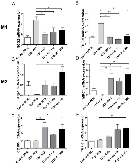 M.C modulated M1 and M2 macrophage polarization in skeletal muscle. The mRNA expression of M1- and M2-specific genes was assessed by qPCR: (A) NOS2; (B) TNF-α; (C) Arg-1; (D) MRC1; (E) CD163; and (F) TGF-β. M1 macrophage makers (A,B), and M2 macrophage makers (C–F). Data are presented as the mean ± SEM (n = 4~5/group). * p < 0.05, ** p < 0.01 vs. CIS+PBS, using a Bonferroni post hoc test after one-way ANOVA.
