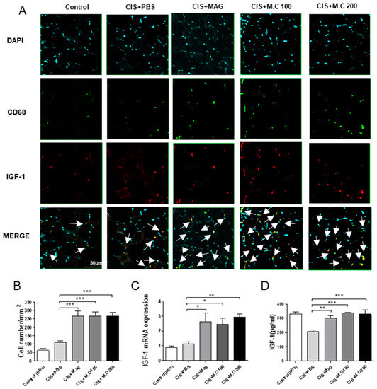 M.C increased the number of macrophages and the expression of IGF-1 in the TA muscle: (A) Immunohistochemistry (IHC) showing CD68 (macrophages, green) and IGF-1 (red) staining in the TA muscle. (Magnification: 40×, scale bar 50 μm). Nuclei are stained with diamidino-2-phenylindole (DAPI) (blue). Merge = IGF-1 + CD68 + DAPI and merged places are indicated by white arrows. (B) The number of IGF-I, CD68, and DAPI positive cells per image area measured on at least five random fields. (C) IGF-1 mRNA expression in the TA muscle tissue measured by qPCR. (D) IGF-1 protein expression in the TA muscle tissue was quantified using ELISA. Data are presented as the mean ± SEM (n = 4~5/group). * p < 0.05, ** p < 0.01, *** p < 0.001 vs. CIS+PBS, using a Bonferroni post hoc test after one-way ANOVA.