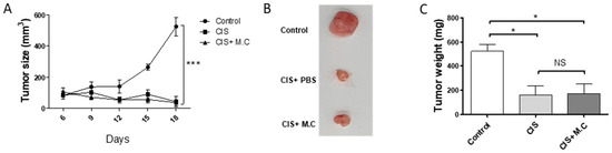 M.C does not interfere with cisplatin activity in tumors. CT26 tumor subcutaneous injections were administered in control, cisplatin (CIS), CIS+M.C (cisplatin+ M.C) treated mice. (A) Tumor size. Tumor volumes measured every 3 days using a caliper. Data are presented as the mean ± SEM (n = 5). * p < 0.05, *** p < 0.001 vs. control, using a two-way ANOVA. Mice were sacrificed on day 18; (B) representative images of the tumors; (C) tumor weight measurement. Data are presented as the mean ± SEM (n = 4/group). * p < 0.05, *** p < 0.001 vs. CIS+PBS, using a Bonferroni post hoc test after one-way ANOVA. NS = non-significant.