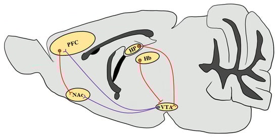 Simplified schematic representation of the mouse brain reward circuitry. The scheme of the mesolimbic DAergic projections (purple) of the mouse brain sagittal section emphasizes the predominant afferents that originate in the VTA and input into the NAc as well as the PFC, which are modulated by stimulant drug exposure through CaMKII functions. Glutamatergic inputs (red) that regulate neuronal circuits in response to drug abuse from the PFC to the NAc and from the HP to the VTA through the subiculum are highlighted []. Since CaMKIIβ regulates synaptic activity in the Hb in the context of depressive behaviors, it increases glutamatergic inputs onto VTA GABAergic interneurons to inhibit VTA DAergic neurons, thereby decreasing the DA release in the NAc [,]. VTA, ventral tegmental area; NAc, nucleus accumbens; PFC, prefrontal cortex; HP, hippocampus; Hb, habenula.