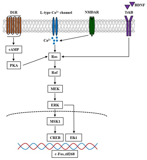 ERK is a serine-threonine protein kinase and a member of the mitogen-activated protein kinase (MAPK) family. It has been reported to play essential roles in cellular proliferation, differentiation, neuronal survival, and synaptic plasticity [,]. ERK has two isoforms, ERK1 (p44 MAPK) and ERK2, which are both expressed throughout the mesolimbic system in the mouse brain, including the regions such as the PFC, NAc, amygdala, and VTA []. ERK is recruited for signaling transfer in response to extracellular stimulations and the initiated signal cascade. BDNF activates receptor tyrosine kinases (RTKs), which are correlated with adapter protein recruitment such as Shc, and causes the activation of GTPase Ras, serine-threonine kinase Raf, and MAPK-ERK kinase (MEK), which in turn, phosphorylate and activate ERK. Moreover, Ras is also activated through L-type calcium channels and NMDAR. The Ca2+ influx evoked by the electrical and pharmacological activation of these channels and receptors plays a critical role in the signal cascade. Furthermore, dopamine D1 receptors (D1Rs) could also elevate Ca2+ influx and lead to the activation of protein kinase A (PKA) and Raf, which further causes ERK phosphorylation []. The phosphorylation of ERK leads to the activation of downstream targets such as Elk-1 transcription factor [], and CREB through mitogen- and stress-stimulated kinase 1 (MSK1) and ribosomal S6 kinase (RSK) [,]. Since ERK is regulated by DAergic and glutamatergic signals, it has been suggested that ERK is involved in psychostimulant-induced addiction and plays a crucial role in the brain reward system and learning process []. Here, we provide a simplified schematic representation of the ERK signal cascade involved in psychostimulant-induced addiction (Figure 2).
