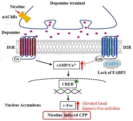 The involvement of FABP3 in stimulant drugs, including nicotine-induced addiction, has not yet been fully investigated. Since there is no specific evidence suggesting that FABP3−/− mice show D2R dysfunction and exhibit behaviors related to the DAergic system, we demonstrated that FABP3−/− mice exhibit impaired CPP behaviors following chronic nicotine administration. This impairment was correlated with the lack of responsiveness of both CaMKII and ERK phosphorylation in the NAc. In FABP3−/− mice, the number of D2R-positive neurons was obviously elevated, whereas the number of D1R-positive neurons and the responsiveness of c-Fos level in response to nicotine, which is closely correlated with CaMKII autophosphorylation levels, were significantly reduced, implying that FABP3−/− mice show aberrant D2R signaling and further affect D1R and c-Fos signaling. These data suggest that FABP3 could be a novel target in nicotine-induced addiction and other drug abuses affecting DAergic signaling and provide evidence for developing novel therapies in the future. Intriguingly, the basal levels of CaMKII autophosphorylation and its downstream target are decreased in the D2R−/− mice NAc and hippocampal CA1 region. However, significantly increased CaMKII autophosphorylation levels were observed in the NAc of FABP3−/− mice. FABP3 is also a target in terms of PTSD-like symptoms as it is correlated with ω-3 and ω-6 PUFA transport [], and ω-3 PUFA supplements ameliorate PTSD-like symptoms in patients []. FABP3−/− mice show increased locomotor activities related to PTSD-like behaviors [], whereas D2R−/− mice exhibit hypolocomotion, implying a disturbance of DA receptor signaling []. Although an increase in intracellular Ca2+/CaMKII signaling induced by D2R stimulation is observed in NG108-15 cells overexpressing the D2L receptor, D2R partially but not completely colocalizes with FABP3 and mediates Ca2+/CaMKII signals independent of FABP3. FABP3 is possibly required to inhibit the function of D2R in D1R signaling since CaMKII autophosphorylation in D2R-positive neurons was increased in the NAc of FABP3−/− mice. Consecutive nicotine administration produces DA level elevation and causes enhanced basal levels of cAMP/Ca2+ signaling through D1R activation, whereas this signaling negatively regulates D2R/FABP3 signaling. D1R activation provokes calcium influx, causing CaMKII activation and its migration to the nucleus, subsequently inducing enhancement of CREB/c-Fos signaling, which underlies the process of nicotine-induced addiction and other drug abuse. However, in FABP3−/− mice, D2R/FABP3 signaling is impaired due to FABP3 deficiency, which eliminates the negative regulation of D2R/FABP3 signaling and leads to elevated cAMP/Ca2+ levels and CREB phosphorylation, as well as c-Fos activities. This constitutively increased signaling could not trigger nicotine addiction and possibly become the underlying mechanism of the failure of nicotine-induced addiction in FABP3−/− mice (Figure 3).