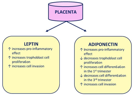 Adiponectin, similarly to leptin, has endo- and paracrine effects in the placenta. This hormone secreted by trophoblast cells has a pro-inflammatory effect, which is mainly manifested in the third trimester of pregnancy []. At the beginning of pregnancy, adiponectin stimulates the secretion of hCG and leptin by syncytiotrophoblast cells, increasing chorion proliferation. These processes become slower in the third trimester of pregnancy []. However, it does not affect the morphology of the placenta at the term of delivery. Similar to leptin, adiponectin promotes the invasion of trophoblast into the temporally altered endometrial mucosa []. The role of leptin and adiponectin in the placenta is presented in Figure 1.