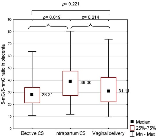 The global DNA methylation profile in the placenta was estimated by the measurement of 5-mC and 5-hmC levels and presented as their ratio. The elective cesarean section group was characterized by a significantly lower 5-mC/5-hmC ratio in the placenta (average: 28.31) in comparison with the intrapartum CS group (average: 39.00, p = 0.019). No significant differences were noted in the 5-mC/5-hmC ratio in the placenta between intrapartum CS and vaginal delivery groups (p = 0.214), as well as between elective CS and vaginal delivery groups (p = 0.221; Figure 2).