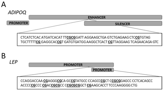 5’-Cytosine-phosphate-Guanine-3’ (CpG) sites selected for methylation-specific quantitative PCR (MS-qPCR). Chromosomal localization and nucleotide sequence in human-based ADIPOQ reference sequence (NC_000003.12) with six CpG sites (A) and LEP (NC_000007.14) reference sequence (NC_000007.14) (B).