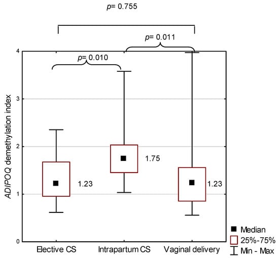 In the intrapartum cesarean section group, the demethylation index for ADIPOQ in the placenta was significantly higher (the average: 1.75) in relation to the elective cesarean section group (average: 1.23, p = 0.010), and in comparison with the vaginal delivery group (average: 1.23, p = 0.011). The ADIPOQ demethylation index in the placenta was not significantly different between the elective CS and the vaginal delivery groups (p = 0.755; Figure 4).