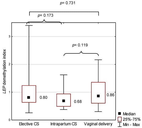 LEP demethylation in placenta did not significantly differ among elective CS, intrapartum CS, and vaginal delivery groups (p > 0.05; Figure 5).