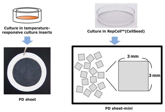 PD sheets and PD sheets-mini were fabricated using a temperature-responsive culture insert and RepCell™ plate (CellSeed Inc.). The latter is a unique temperature-responsive culture plate with 3 mm × 3 mm grid walls etched into the culture surface. The areas of the culture dishes were 4.2 cm2 and 8.8 cm2, respectively (Figure 1).