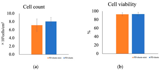 After culturing for 2 weeks, both PD sheets-mini and PD sheets were collected, and the cell count corrected by the area of the culture surface was calculated. The cell count and viability did not differ significantly between PD sheets-mini and PD sheets (Figure 2a,b).