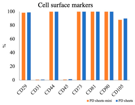 PD sheets-mini and PD sheets showed similar surface markers (Figure 3). Both sheets were negative for CD31, a vascular endothelium marker, and CD45, a blood cell marker: PD sheets-mini CD31 0.7%; CD45, 0.8%; PD sheets CD31, 0.8%; CD45, 1.4%. Both types of sheet were positive for the mesenchymal stem cell (MSC) markers CD29, CD44, CD73, CD81, CD90, and CD105: PD sheets-mini CD29, 98.4%; CD44, 99.9%; CD73, 99.9%; CD81, 100%; CD90, 99.9%; CD105, 88.1%; PD sheets CD29, 98.9%; CD44, 99.9%; CD73, 100%; CD81, 100%; CD90, 99.9%; CD105, 90.0%.
