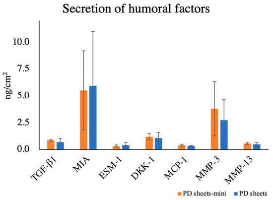 Amounts of secreted humoral factors. The amounts of transforming growth factor beta-1 (TGF-β1), melanoma inhibitory activity (MIA), endothelial cell-specific marker 1 (ESM-1), Dickkopf-1 protein (DKK-1), monocyte chemoattractant protein 1 (MCP-1), matrix metalloproteinase (MMP)-3, and MMP-13, humoral factors related to cartilage, did not differ significantly between PD sheets-mini and PD sheets.