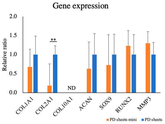 Cartilage-related gene expression analysis in PD sheets and PD sheets-mini. The relative gene expression of PD sheets was set at 1.0. The values are expressed as mean ± standard deviation. ** p < 0.01; ND, not detected. Only the expression of COL2A1 differed between PD sheets and PD sheets-mini.