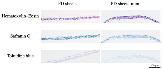 Histological analysis of PD sheets and PD sheets-mini. Sections of both PD sheets and PD sheets-mini were stained with hematoxylin–eosin, safranin O, and toluidine blue (×10, scale bar = 100 μm).