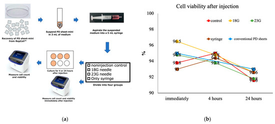 Evaluation of the effect of injection on cell viability of PD sheets-mini. (a) To examine the effect of injection on cell viability, the PD sheets-mini suspension was examined under four conditions: non-injection control, 18 gauge (G) needle injection, 23G needle injection, and syringe injection, and cell viability was measured at 0, 4, and 24 h after injection. At 0 and 4 h after injection, cell viability of conventional PD sheets was compared. (b) Comparison of cell viability of PD sheets-mini between the four conditions immediately after, 4 h, and 24 h after injection. Cell viability decreased with time but did not differ significantly between the four conditions at any time.