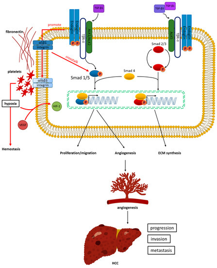 In well-differentiated HCC, endoglin expression was found to be the highest. Conversely, endoglin showed downregulation in poorly differentiated HCC [66]. Endoglin mainly exists in the microvessels of the tumor periphery, whereas TGF-β1 is present only within tumor hepatocytes [65]. Benetti et al. found that HCC-derived TGF-β1 functions as a chemoattractant for endothelial cells expressing endoglin and as a tumor angiogenesis promoter. It is reasonable to hypothesize that selective targeting of TGF-β1/endoglin (CD105) signaling could inhibit angiogenesis and the subsequent progression of HCC.