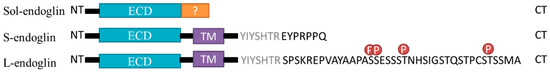 A schematic of endoglin structure. The soluble endoglin (sol-endoglin), short isoform endoglin (S-endoglin) and long isoform endoglin (L-endoglin). Relevant domains such as the extracellular domain (ECD), transmembrane domain (TM), cellular domain (CD) and phosphorylation sites by TGF-βII and ALK1 are indicated.