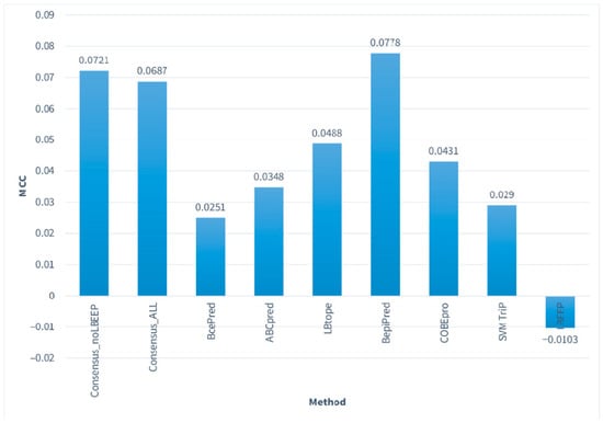 Matthews Correlation Coefficient (MCC) values achieved by all methods tested on the Consensus_NR data set at 20 amino acid residues in “per peptide” mode. The vertical axis represents the MCC value for all the methods and the horizontal axis the names of these methods. The best MCC is achieved by the BepiPred method, followed closely by our Consensus methods, while the worst performers are the LBEEP, SVMTriP, and BcePred methods.