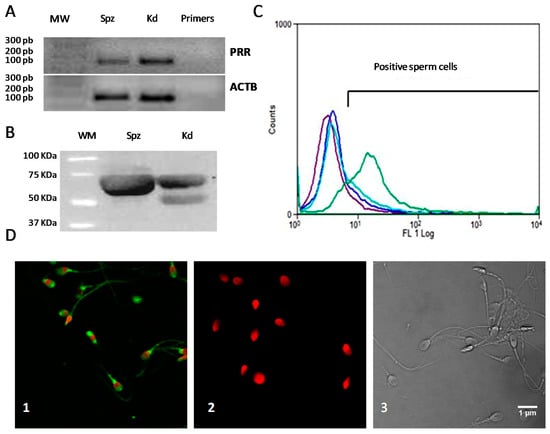Next, we described the presence of PRR protein by immunoblotting. Figure 1B shows a representative western blot using human sperm cells and human kidney, used as a positive control. The anti-PRR polyclonal antibody showed immunoreactivity at 56 kDa in human sperm protein extracts. In the kidney tissue, however, we detected two bands of 50 kDa and 70 KDa. No immunoreactivity was observed when the primary antibody was omitted before secondary antibody addition. Flow cytometry analyses confirmed the presence of PRR in human spermatozoa and the 68.99 ± 1.75% of cells were positive for PRR (Figure 1C). To assure that the fluorescence came only from spermatozoa, PRR signal was only measured in Hoechst-positive cells. The specificity of the primary antibody was confirmed using non-specific rabbit immunoglobulin fraction at the same concentration as the primary antibody. Secondary antibody specificity was evaluated by omitting the primary antibody before secondary antibody addition (Figure 1C).