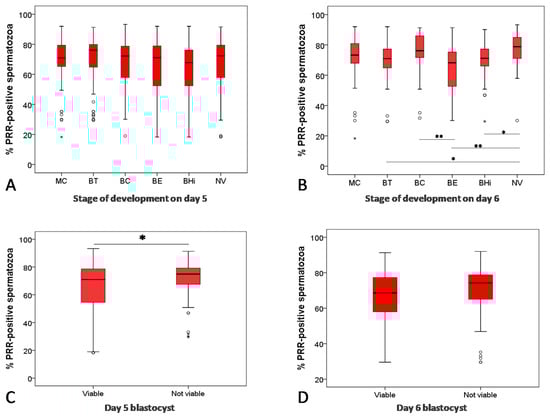 Considering that blastocysts have a higher implantation potential than early embryos, we also analyzed the association between PRR and the developmental stage of embryos in the later phase of in vitro development (Figure 2A,B). We observed that blocked or degenerated blastocysts (BD) were related to semen samples with higher levels of PRR-positive spermatozoa than early (BT), expanded (BE) and hatching/hatched (BHi) blastocysts (Figure 2B).