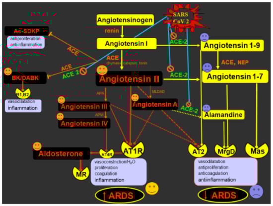 One of the most discussed issues currently is the role of the RAAS in the process of SARS-CoV-2 infection and its complications, including ARDS development. SARS-COV-2, a member of the Coronaviridae family, binds by its spike (S) protein to the cell surface and enters cells via a cell membrane-bound carboxypeptidase angiotensin-converting enzyme 2 (ACE2), expressed in the lungs, heart, vasculature, bowels or kidney [,]. The physiological role of ACE2 is to convert Ang I to Ang 1-9 and Ang II to Ang 1-7. Compared to the classical ACE/Ang II/AT1 route, which gives rise to vasoconstriction, hypertrophic growth and fibrosis, coagulation, oxidative stress and inflammation, the ACE2/Ang1-9/Ang1-7/Mas pathway is perceived as a protective way opposing the deleterious action of Ang II by promoting vasodilation and natriuresis, and inhibiting inflammation or fibrosis. This cascade acts via Ang 1-7 binding to the Mas receptor, Ang 1-9 interaction with the AT2 receptor or, when metabolized in an alternative breakdown pathway, via alamandine and MrgD receptor [,].