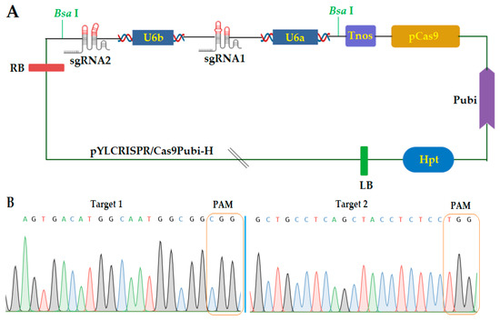 (A) Schematic representation of pYLCRISPR/Cas9 vector construction and (B) sequencing peak map of both target sites assembled in vector. sgRNA, single guided RNA; LB, left border; mpCas9, Cas9 protein; U6, rice U6 promoter; HPT, hygromycin phosphotransferase gene; Bsa, cutting sites; Pubi, maize ubiquitin promoter; Tnos: gene terminator, RB, right border; PAM, protospacer adjacent motif.