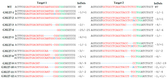 Two mutant lines (GXU27-4 and GXU27-9) showed homozygous mutations for both target sites. GXU27-4 exhibited 25 bp and 6 bp deletions at the first and second target positions, respectively. GXU27-9 presented 9 bp and 19 bp deletions at the first and second target locations, respectively (Figure 2). Deletion and insertions with at least one nucleotide were achieved successfully.