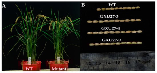 (A) Plant type and (B) grain phenotype of wild type (WT) and mutants (GXU27-3, GXU27-4, and GXU27-9) in the T1 generation.