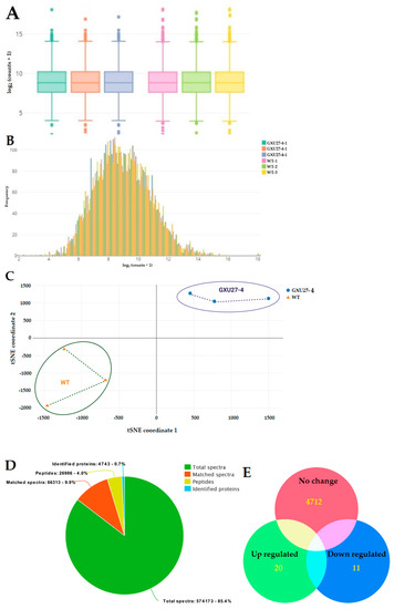 Basic information about the outcome from the proteomic analysis. (A) Representation of count data distribution with log2 values in a Box and Whisker plot. (B) Histogram showing the frequency of count data distribution of transformed data (C) Two-dimensional t-Distributed Stochastic Neighbor Embedding (t-SNE) graph representing the statistical difference between wild type (WT) and mutant line (GXU27-1) (D) Information about total spectra, identified matched spectra, peptide, and identified proteins and (E) Venn diagram showing the distribution of differentially expressed proteins (DEPs).