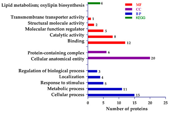 The results of significant GO enrichment showed that from the perspective of BP, the DEPs were significantly enriched (p-value ≤ 0.05) in the cellular process, metabolic process, response to stimulus, localization, and regulation of the BP. Regarding CC, the GO functional attributes were significantly enriched in cellular anatomical entity and the protein-containing complex. Finally, regarding the MF perspective, the DEPs were significantly enriched in binding, catalytic activity, molecular function regulator, structural molecule activity, and transmembrane transporter activity. The result of significant enrichment of the KEGG pathway showed that DEPs were only enriched in lipid metabolism and oxylipin biosynthesis.