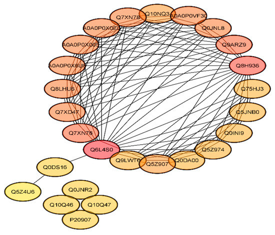 The Search Tool for the Retrieval of Interacting Genes/Proteins (STRING) database was used to find the protein interactions. After retrieving proteins with the highest connectivity from the projected network, higher interaction was found between Q6L4S0 (DNA damage-binding protein 1), Q8H936 (JUN-activation-domain-binding protein 1), Q7XN7 (ubiquitin-40S ribosomal protein S27a-2), Q9ARZ9 (ubiquitin-40S ribosomal protein S27a-1), Q7XD47 (putative ubiquitin/ribosomal protein S27a fusion protein), A0A0P0X6U8 (putative ubiquitin/ribosomal protein CEP52), A0A0P0X005 (ubiquitin family protein), A0A0P0X0E0 (pentameric polyubiquitin-like), Q7XN78 (polyubiquitin 3 Ubiquitin-related Ubiquitin, and A0A0P0VF30 (polyubiquitin) (Figure 6) with a degree higher than 12 (Supplementary File S1). Some proteins including P20907 (cysteine proteinase inhibitor 2), Q0JNR2 (cysteine proteinase inhibitor 12), Q10Q47 (putative cysteine proteinase inhibitor 7), Q10Q46 (cysteine proteinase inhibitor 6), Q0DS16 (PP1/PP2A phosphatases pleiotropic regulator PRL1), and Q5Z4U6 (putative C2H2 zinc-finger protein) showed a degree value of less than 3 and no or poor interaction with other proteins. The above results revealed that the DNA-damage binding proteins and ubiquitin ribosomal proteins were found to be highly interactive, whereas cysteine proteinase inhibitor proteins showed poor or no interaction.