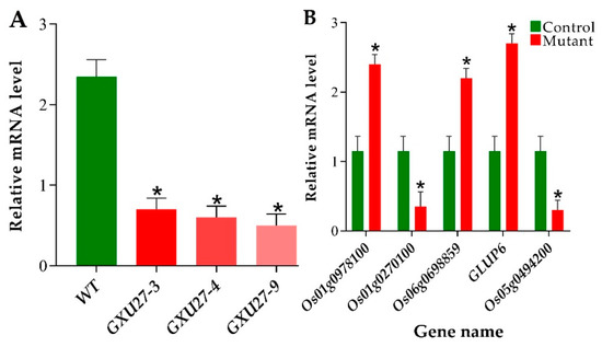 RT-qPCR-based assessment of GS3 expression and validation proteomic experiment. (A) The expression level of GS3 in wild-type (WT) and mutant plants. (B) Expression analysis of five selected genes associated with differentially expressed proteins (DEPs). * Denotes a significant difference, Student’s t-test, p ≤ 0.01, n = 3.