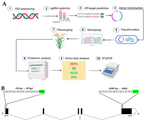 (A) Schematic diagram of the procedure for CRISPR/Cas9-based generation of mutant plants and analysis of mutations. Two sgRNAs were selected using the CRISPR-GE online web-based tool, and vector was constructed. Agrobacterium-mediated transformation was performed, and T0 plants were regenerated. Later generations were produced by self-pollination, and genotyping was performed using target-specific primers. The phenotypic data of mutant and wild-type (WT) plants were recorded and further analyzed. The proteomic analysis was also performed, and RT-qPCR was performed to assess the GS3 expression level and validate the proteomic data. (B) Diagram of GS3 gene and positions of both target sites. ATG is the start codon; TGA is the stop codon; green highlighted CGG and TGG are the PAM sequences; the white boxes at extreme left and right represent the untranslated (UTR) regions, the black boxes represents the exons; black lines in between the exon regions represent the intron regions, T1 and T2 represent target 1 and target 2, respectively.