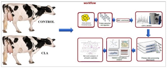 The phosphoproteomic strategy focused on quantitative mass spectrometry (MS) and was adopted to recognize and characterize changes in phosphorylation in dairy cows supplemented with conjugated linoleic acid (CLA) vs. control (CON), and also to compare the phosphoproteome of SC and OM AT.