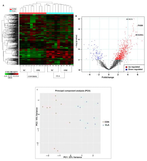 Differential expression analysis of phosphoproteome by IDEP 9.1 server using fold change and p-values of phosphopeptides. (A) Heat map analysis of significantly expressed phosphopeptides of control cow subcutaneous (SC) AT (C1–C5); control cow omental (OM) AT (C6–C10); CLA-supplemented cow SC AT (T1–T5); CLA supplemented OM AT (T6T10). The data represent the mass intensity of each peptide in the individual cows. Red boxes indicate upregulation, green boxes represent downregulation, and black boxes represent no change. (B) Volcano plot illustrates the significant expressed peptides of CON vs. CLA-supplemented dairy cows. The significant upregulated peptides are in red color and downregulated are in blue color. X-axis represents fold change and y-axis represented p-value. FASN-fatty acid synthase; ACACA-acetyl-CoA carboxylase 1; BCKDHA-branched-chain keto acid dehydrogenase E1 alpha. (C) Principal component analysis (PCA) of 22% variance in CON vs. CLA-supplemented SC and OM AT. PCA representing the separation of CON (red circles) with CLA-supplemented (blue triangles) samples.