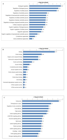 Significant altered phophopeptides were enriched by Gene ontology using BINGO in Cytoscape. Bar graphs summarizing the GO enrichment analysis, molecular function and pathways for the phopho peptides of CLA vs. CON subcutaneous and omental AT in dairy cows. The −log10 (p-value) on the x-axis and GO terms represented on Y-axis. (A) Top 15 significant GO terms associated with the phospho peptides in CLA vs. CON. (B) Top 15 molecular functions of the phospho peptides in CLA vs. CON. (C) Top 15 KEGG pathways enrichment analysis for the phospho peptides in CLA vs. CON. Number of peptides in each category was labelled on the bars.