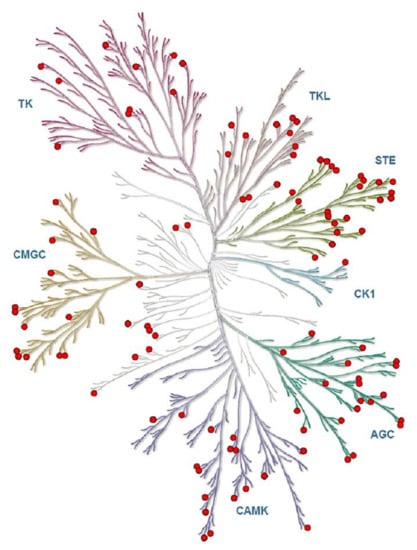 The predicted kinases of phosphoproteome in CLA-supplemented OM and SC AT were represented in kinome tree using the kinmap server. The identified kinases of phosphoproteome of SC and OM AT of dairy cows represents AGC: PKA/PKG/PKC-family kinases; CAMK: calcium/calmodulin-dependent kinases; CK1: casein kinases; CMGC: CDK/MAPK/GSK3/CLK-family kinases; STE: sterile homologue kinases; TK: tyrosine kinases; TKL: tyrosine kinase-like kinases. Phosphorylation sites of kinases are in Red circles. The kinases are separated as branches in the tree based on the category. Kinome tree Illustration reproduced courtesy of Cell Signaling Technology, Inc. (www.cellsignal.com, accessed on 12 December 2020).