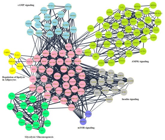 Network functional enrichment analysis revealed components of the pathway of fatty acid metabolism and enzymes are mapped onto the network. Using ClusterONE, linked protein clusters in the network were analyzed and five clusters out of six (p < 0.05) and one in six clusters with a p value of < 0.1 (Lipolysis in Adipocytes) were identified. Ontology/pathway research has evaluated the functions of each of these modules, and pathways related to lipid metabolism were clustered in cytoscape representing in different colors (Figure 5). The network analysis revealed the mechanism of altered PP during CLA supplementation, and suggested enrichment of lipolytic and lipogenic pathways. Among the clusters, the cluster shown in light green included AMPK signaling involved in the regulation of lipogenesis by controlling ACACA. This cluster included lipid metabolism components PRKACA, TJP1, and SRC, and found to be in close interaction with kinases, such as AKT1, AKT2, and MAPK3 (Supplementary Figure S1). The mTOR signaling components RPS6KA1, RPS6KA3, EIF4EBP1, and MTOR were found in the purple color cluster, and most of these acted as hubs in lipid metabolism. The components of the mTOR network contain highest number of hubs involved in lipid metabolism. Proteins involved in gluconeogenesis were depicted in the cluster shown in green. It is important to note that in AT of cows supplemented with CLA, most proteins in both these clusters exhibited phosphorylation. cAMP signaling network was in light blue color cluster with ROCK1, PLN, CALM, and SLC9A1. Regulation lipolysis in adipocytes components such as LIPE, FABP4, PNPLA2, AKT1, and ADCY5 were present in the cluster shown in a yellow color. Insulin signaling pathway components such as FOXO, PCK, and AKT were found to also control ACACA in the cluster of grey color in close proximity to proteins (Supplementary Figure S2). The gluconeogenesis pathway includes important components of lipid metabolism such as ACSS2, PDHA1, and PKM shown in a green color. Therefore, our network review highlighted the connection of components that were important in collaborating to construct cellular physiology and metabolic process.