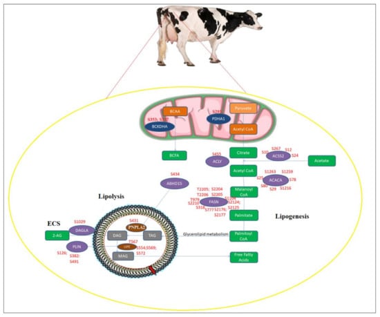 In the present study, the changes in the phosphoproteome caused by CLA were studied by the k-means clustering of the differentially expressed PP. Among the differentially abundant PP, ACACA, MAP4, ENAH, FASN, SLC16A7, AKAP12, DDHD2, and BCKDHA were significant in AT, that were related to insulin signaling, lipolysis in adipocytes, MAPK signaling, gluconeogenesis, and the mTOR signaling pathways. Lipid metabolism includes the following processes: lipolysis, fatty acid oxidation, lipogenesis, cholesterol synthesis, and ketone body synthesis (Supplementary Figure S3). Lipogenesis is manifested by the aberrant trafficking of acetyl CoA in mitochondria and dependent on PDHA1 phosphorylation. In cytoplasm, acetyl CoA is formed from the precursors acetate and citrate by ACSS2 and ACYL, respectively. We identified ACSS2 and ACYL with elevated phosphorylation in CLA AT, suggestive of an upregulation in acetyl CoA formation and subsequent import in the AT of cows with CLA supplementation. In addition, we observed the enrichment of AMPK signaling, which is known to be a key modulator of lipogenesis. Insulin signaling, cAMP signaling, and mTOR signaling components were high in number and also showed altered phosphorylation sites with CLA treatment (Supplementary Table S2). In addition, we have also observed the phosphorylation of ACACA, a recognized lipogenesis regulator. From the bioinformatics analysis of AT, it was observed that AMPK signaling is the one of the top pathways of the phosphoproteome, which controls the mechanism of ACACA and the rate of lipogenesis. With regard to the phosphorylation events of lipolysis, PNPLA2 was upregulated with phosphorylation at the site serine 431, and this is the initiating step of lipolysis, where TAG is converted to DAG. Interestingly we observed the downregulation of LIPE and hence the conversion of DAG to MAG is reduced, which leads to the more abundant availability of DAG in lipid droplets of adipocytes. We also observed the upregulation of DAGLA with phosphosite at serine 1029, which is related to the ECS by converting DAG to the main endocannabinoid 2-AG.