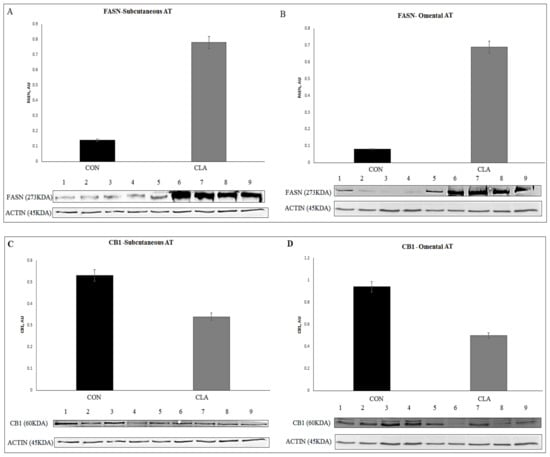 Immunoblot analysis of lipogenesis was measured by the abundance of FASN in CON vs. CLA (n = 1–4 replicates for CON; n = 5–9 replicates for CLA). (A) Abundance levels of FASN in subcutaneous (SC); (B) abundance levels of FASN in omental (OM) AT in CLA and CON. Immunoblot analysis of the endocannabinoid receptor CB1 abundance in CON vs. CLA (n = 1–4 replicates for CON; n = 5–9 replicates for CLA). (C) Abundance of CB1 in subcutaneous (SC); (D) omental (OM) AT CLA and CON. Actin was used as a control to quantify the proteins.