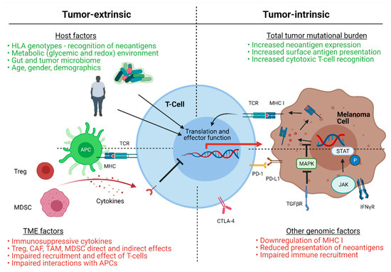 Proposed mechanisms of resistance to immune checkpoint inhibition in melanoma. In green are factors associated with potential immune checkpoint inhibitor responsiveness, while red highlights factors associated with potential resistance to therapy. Tumor extrinsic mechanisms include host factors and tumor microenvironment (TME) factors. Host factors include: immune recognition via specific human leukocyte antigen (HLA) genotypes, metabolic factors, such as obesity and diabetes; the gut/tumor microbiome; demographics, such as age or gender. TME factors include: an immunosuppressive cytokine milieu; the presence of regulatory T-cells (Treg); cancer associated fibroblasts (CAF); tumor associated macrophages (TAM)); myeloid derived suppressor cells (MDSC) and other cell types. Each elicits specific effects on T-cell recruitment and activity, and may impair interactions between antigen presenting cells (APCs) and T-cells. Tumor-intrinsic mechanisms include overall tumor mutational burden and other tumor genomic factors. High tumor mutational burden increases neoantigen expression and surface antigen presentation for recognition by activated cytotoxic T-lymphocytes, augmented with the use of immune checkpoint inhibition. Tumor cell mutation of specific oncogenic drivers or signaling pathways results in altered responses to interferon gamma and reduced presentation of neoantigens on major histocompatibility complex (MHC) I, ultimately altering immune effector recruitment and activation. TCR (T-cell receptor); PD-1 (programmed cell death protein-1); PD-L1 (programmed death-ligand 1); CTLA-4 (cytotoxic T-lymphocyte antigen 4); MAPK (mitogen activated protein kinase); STAT (signal transducer and activator of transcription); JAK (Janus kinase); TGFβR (transforming growth factor beta receptor); INFγR (interferon gamma receptor); P (phosphorylated).