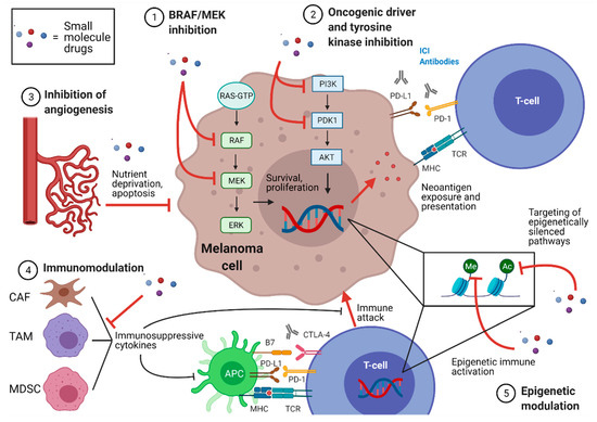 Potential mechanisms of synergy between small molecules and immune checkpoint inhibition in melanoma. Colored dots represent small molecule drugs. Intracellular ablation of Braf proto-oncogene/mitogen-activated protein kinase kinase (BRAF/MEK) in the mitogen activated protein kinase (MAPK) pathway (1), of oncogenic drivers such as those involved in the phosphoinositide-3-kinase/protein kinase B (PI3K/AKT) pathway or of other tyrosine kinases (2) induce apoptosis, resulting in increased presentation of neoantigens at the cell surface to primed and activated T-cells in the tumor microenvironment (TME). Extrinsic to the tumor cell, anti-angiogenic drugs (3) may impair nutrient delivery to tumor cells, resulting in tumor cell death and immune clearance. In the immune axis, immunomodulator drugs (4) may impair immunosuppressive cell types such as cancer associated fibroblasts (CAF), tumor associated macrophages (TAM), and myeloid derived suppressor cells (MDSC), including the cytokines they secrete which hinder cytotoxic T-cell function. Epigenetic modulator drugs may have bi-fold effects (5), exposing epigenetically silenced pathways (methylated, Me, or acetylated, Ac) within tumor cells, or alternatively activating pathways within immune effector cells including but not limited to immune checkpoints. APC (antigen presenting cell); MHC(major histocompatibility complex); RAS-GTP (Ras proto-oncogene guanosine triphosphate); ERK (extracellular signal-regulated kinases); PDK1 (phosphoinositide dependent kinase 1); TCR (T-cell receptor); PD-1 (programmed cell death protein-1); PD-L1 (programmed death-ligand 1); CTLA-4 (cytotoxic T-lymphocyte antigen 4).