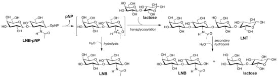 Synthesis of lacto-N-tetraose (LNT) by transglycosylation with engineered lacto-N-biosidase (LnbB) variants. Hydrolysis: primary hydrolysis of the donor substrate; secondary hydrolysis: hydrolysis of the product.
