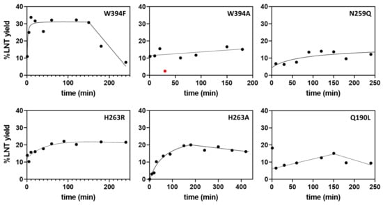 When plotting LNT maximum yield of the transglycosylation reaction (%LNT) against hydrolase activity on LNB-pNP (SAH in the absence of acceptor), the different mutants can be clustered in three groups (Figure 4): mutant enzymes with residual hydrolase activity (SAH) >1.6% of the wt, which do not have (or have low) transglycosylation activity, highly inactive mutants with SAH <0.05% of the wt, and mutants that lay in between, with 0.05% < SAH < 1.6%, which present significant transglycosylation activity. In this last group, six mutants show a maximum LNT yield higher than 15% (W394F, W394A, Q190L, N259Q, H263R, H263A), highlighting the role of these residues in the donor subsites, Trp394 in subsite -1, and Gln190, Asn259 and His263 in subsite -2, whose mutation strongly reduces the hydrolase activity and enhances the transglycosylation capability in the presence of acceptor. Larger enzyme inactivation, as in the mutants with SAH lower than 0.05% of the wt enzyme, leads to essentially dead enzymes unable to catalyze neither hydrolysis nor transglycosylation. Therefore, a window of strongly reduced but not abolished hydrolase activity (in the range of 0.05 to 1.6% of the wt activity) seems to furnish the mutant with transglycosylating activity. Of all mutants, W394F was the most promising with 32% yield in LNT formation and a significant life-time of the product before secondary hydrolysis became significant (Figure 3).