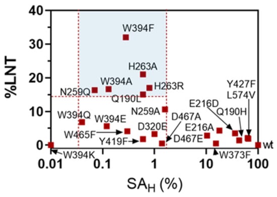 Transglycosylation yields (%LNT) vs. hydrolase activity (SHA) plot for LnbB mutants at donor subsites. Transglycosylating mutants are those with a SAH between 0.05 and 1.6 % of the wt enzyme.